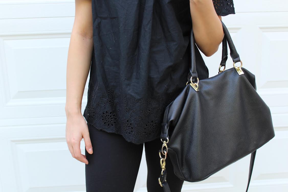 Yesterday was Father's Day and it was a great one! I spent the day visiting my uncles and grandfathers and then out to dinner with my dad and family! I wasn't sure what to wear and I scrambled to find something in the morning while getting ready. So I normally don't wear all black, especially in the Spring/Summer but I am so loving this look. It was kind of a cloudy day so the sun wasn't beaming too much which made it much more bearable to wear an all black outfit, but the humidity was on another level (that's why my hair is frizzy lol). My OTS top is from Old Navy and my awesome black pants are from Marshall's. The top has some really cute eyelet detailing at the sleeves and bottom. To break up the look a bit I went with gray/purple slides. They really add a fun touch to the look! And I have to say, I like how they look! They are from H&M and are soooo comfortable and cute, which is such as plus! My bag is also from H&M and it's the perfect size for me! I also accessorized with a gold, delicate choker (that I always wear) and a coral/pink colored lip! I love a fun lip color for the summer months!